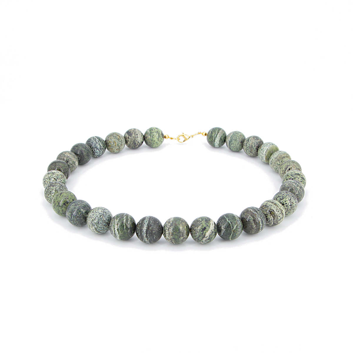 Collier fait main en jaspe zèbre d’Afrique oversize. Un bijou audacieux et minéral, symbole de vitalité, d’équilibre et de force intérieure.